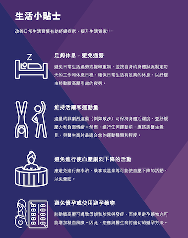 日常生活困難重重:行走二十至五十米便要停下休息(上樓梯、走斜路、行山更是大忌),洗澡尤其辛苦,連洗頭也要分三個部分完成,每完成一部分便得休息一會兒。由於氧氣設備(製氧機及後備電池)過於笨重,她難以自行攜帶外出,只能放棄使用。近月偶有「心慌、漏跳」,但頻率不高。她已預約醫生,了解新治療法的可能性,她希望能在病情尚未惡化之前,就有機會獲得新治療,而不是等到病情最嚴重時才合資格使用。但她亦坦言根本無能力負擔新療法的長期開支,會因為此開支負擔無奈放棄用藥。